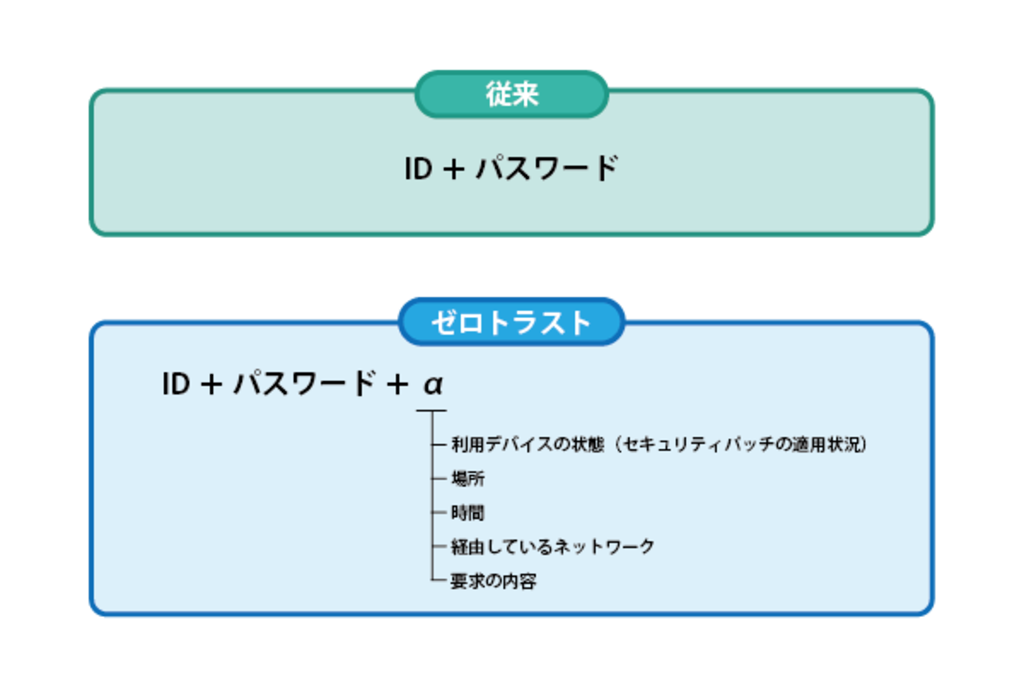 ゼロトラストの考え方に基づき、アクセスを試みるすべてのユーザーや端末を「何も信頼しない」前提で、その都度認証と評価を行います。