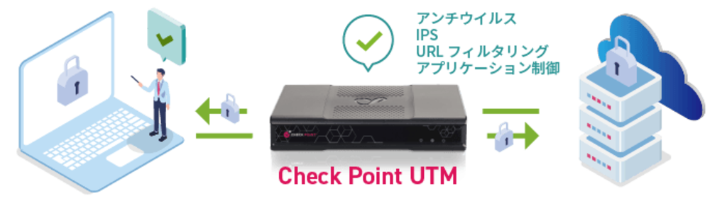 Check Point 1500シリーズは「SSLインスペクション」機能を搭載しており、UTM単体で暗号化通信の検査が可能です。ダウンロードファイルやメールの添付ファイルのマルウェア検出はもちろん、IPS、URL フィルタリング、アプリケーションコントロールといった各種UTM機能で、暗号化通信に潜む様々な脅威を検知、遮断します。