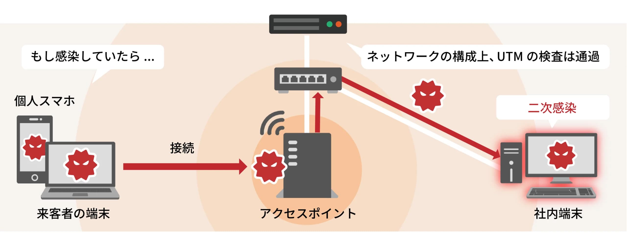 アクセスポイントを入り口にしたサイバー攻撃が増加している一因として、社員個人のモバイル端末が感染源となる事例が挙げられます。