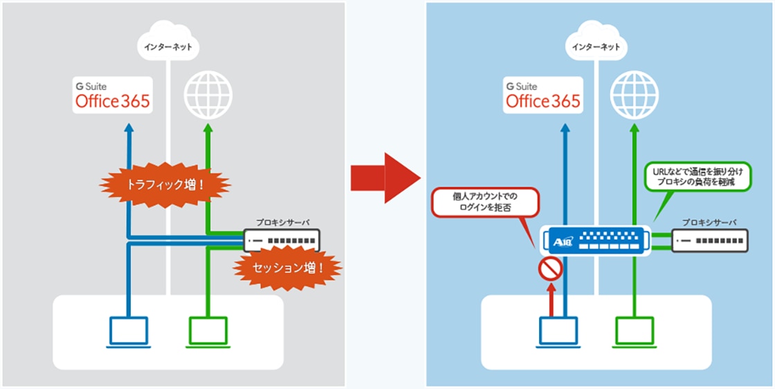 Microsoft365 などのクラウドサービス宛の通信を識別し、通信の振り分けを行うことで既存プロキシの負荷軽減を実現します。