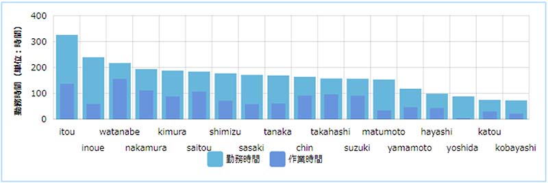 「作業時間カレンダー」や「勤務時間ランキング」など、業務管理のためのさまざまな分析結果を表示します。