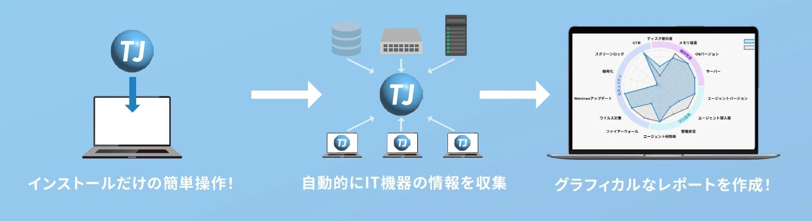 TJ Health Care は、誰でも簡単にオフィスのIT資産を自動で見える化できるサービスです。